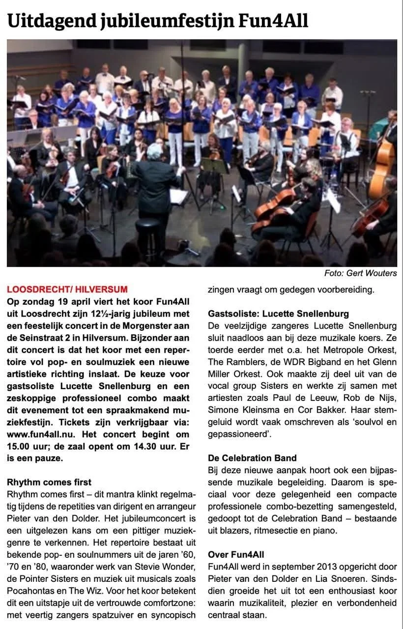 Op zondag 19 april 2026 ben ik gastsoliste bij het Loosdrechtse koor Fun4All die haar 12½ -jarig jubileum viert met een feestelijk Pop & Soulconcert.